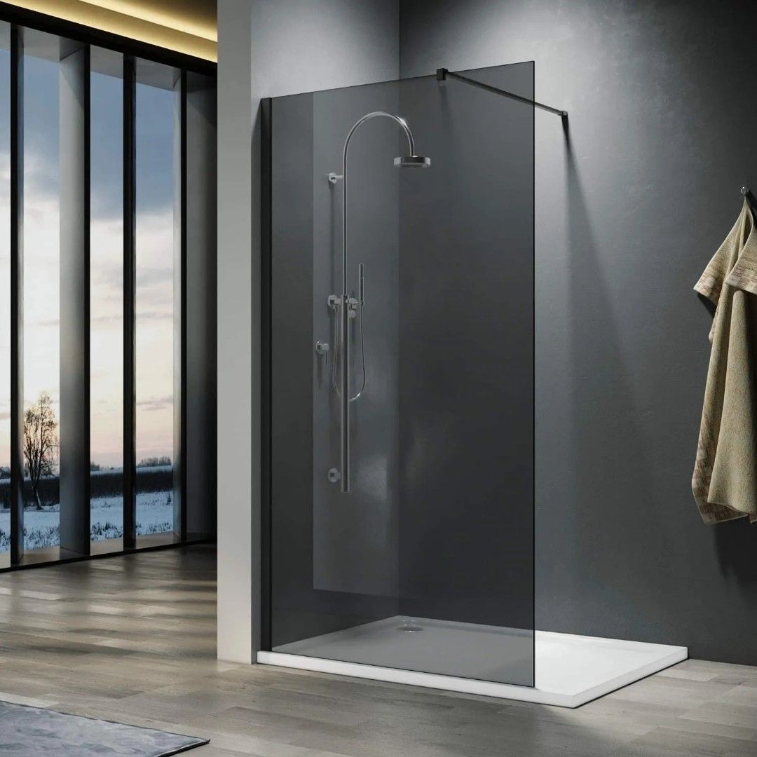 Для изготовления применяют безопасное закаленное стекло толщиной 6 мм, надежно фиксируемое алюминиевым профилем. Цвет профиля черный.Преимущества:Профиль - алюминиевый, черный (Без расширительного профиля);Стекло - закаленное, тонированное, толщиной 6 мм;Ширина входа до 1200мм (регулируется штангой при установке) Внимание! Производитель оставляет за собой право вносить изменения в конструкцию и комплектацию моделей без предварительного уведомления!