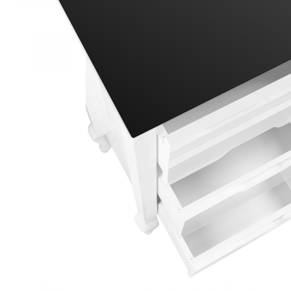 Премиальная отделка: комбинация глянцевой белой эмали, массива бука и черной стеклянной столешницы