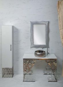 Консоль с раковиной Aura шириной 110 см цветом хромКонсоли произведены из нержавеющей стали благодаря чему стойки к коррозии. Гальваническое покрытие исполнено в цветах хром и золото. Можно выбрать столешницу из мрамора, хрустального каленого стекла в различных цветовых исполнениях, и Solid Glass (передовой материал, в состав которого входит мраморная крошка и стекло). Раковины-чаши выполнены из Corian, которыми можно дополнть консоли, хрустального стекла, керамики. Хорошим дополнением к консолям являются пеналы ArmadiArt, а также сифоны, клик-клаки и смесители Boheme.Мебель можно дополнить пеналом и зеркалом