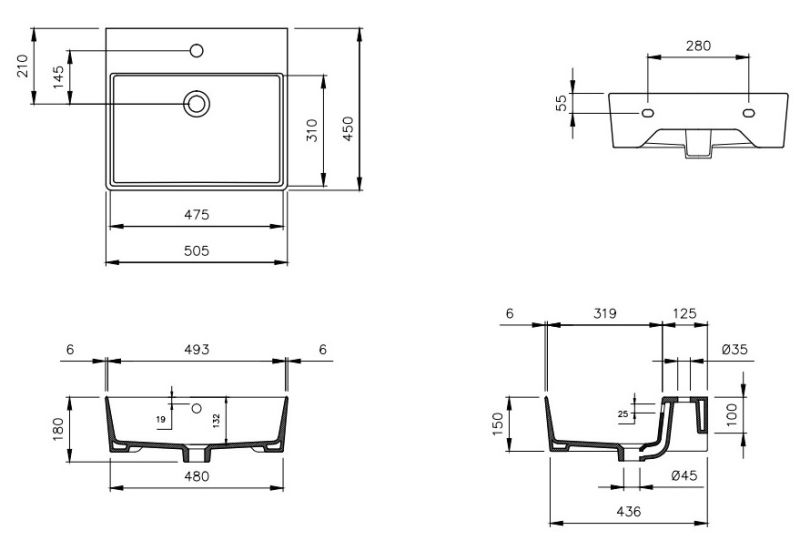 • Отверстия под смеситель: