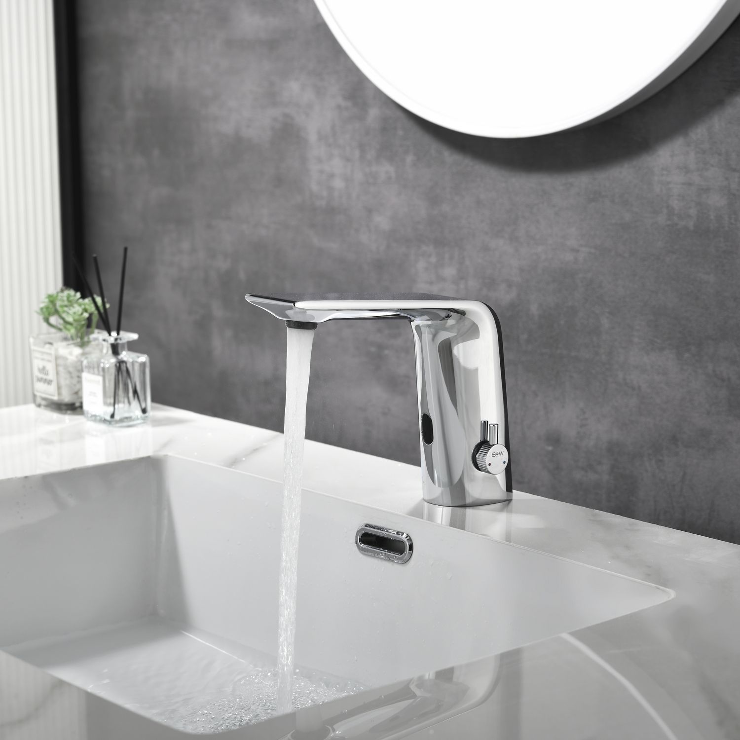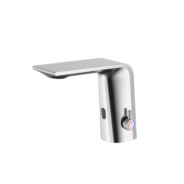 Смеситель для раковины датского производителя Black&White. Изделие изготовлено из сантехнической латуни – данный материал безопасен для здоровья и выдерживает высокое давление. Сверху корпус покрыт хромоникелевым покрытием, которое не корродирует. Открытие воды происходит с помощью инфракрасного датчика, который работает на аккумуляторе постоянного тока. Данное решение гигиенично и экономит воду, особенно в общественных помещениях. Настройка температуры вынесена на ручку расположенную справа от снования. Комбинация округлого основания и плоского излива гармонично вольется в современные интерьеры ванной комнаты.