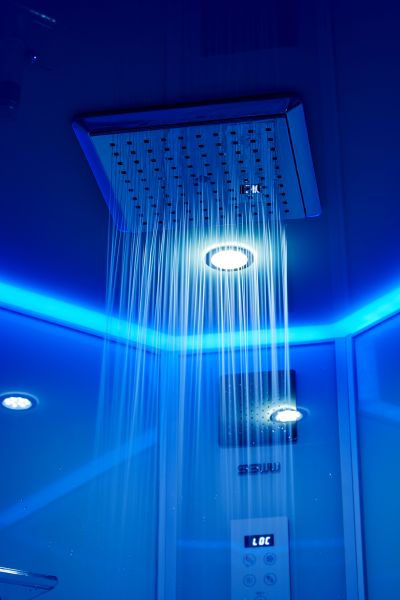 Центральная панель – белое стекло с накладкой из нержавеющей стали с силиконовыми форсунками и смесителем из латуни;