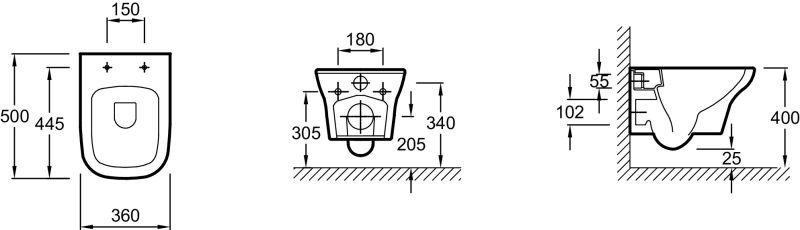 • Прилегание унитаза к стене: